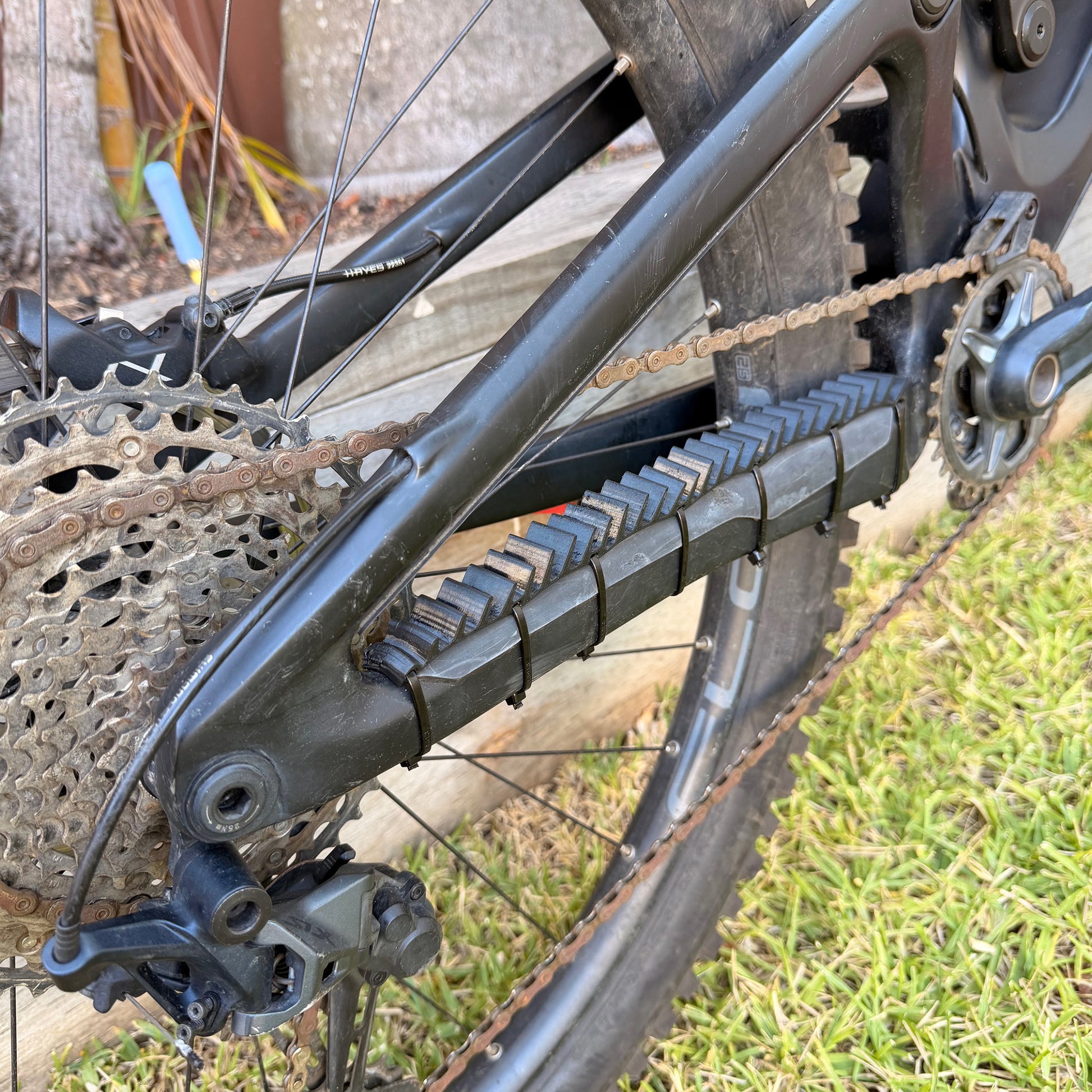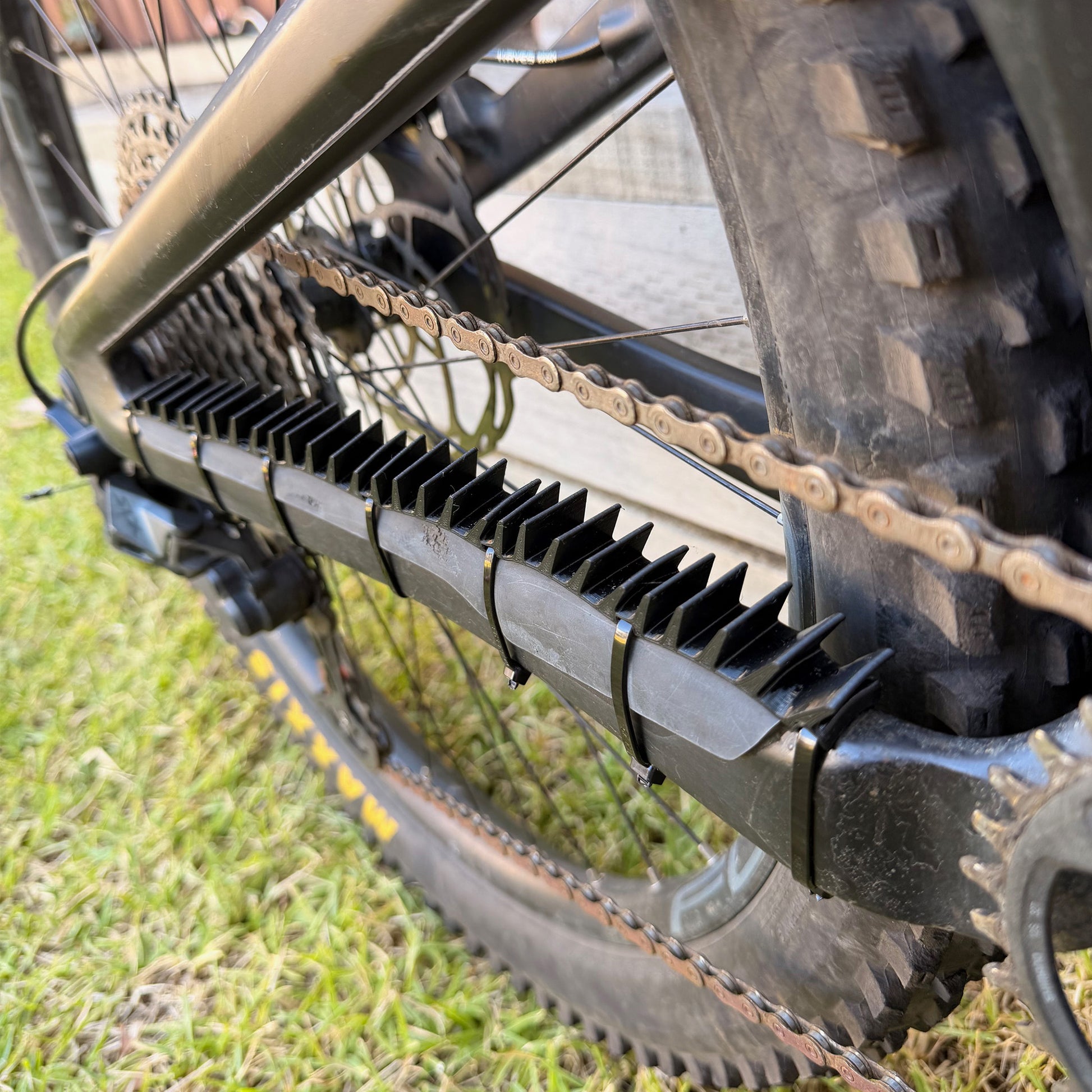 Designed in conjunction with Zoran from Raw Box Productions the Shhhtrip is a 3D printed rubber strip that attaches to your chain stay using (included) zip ties. In testing the Shhhtrip completely eliminated chain slap noise resulting in a super quiet ride.